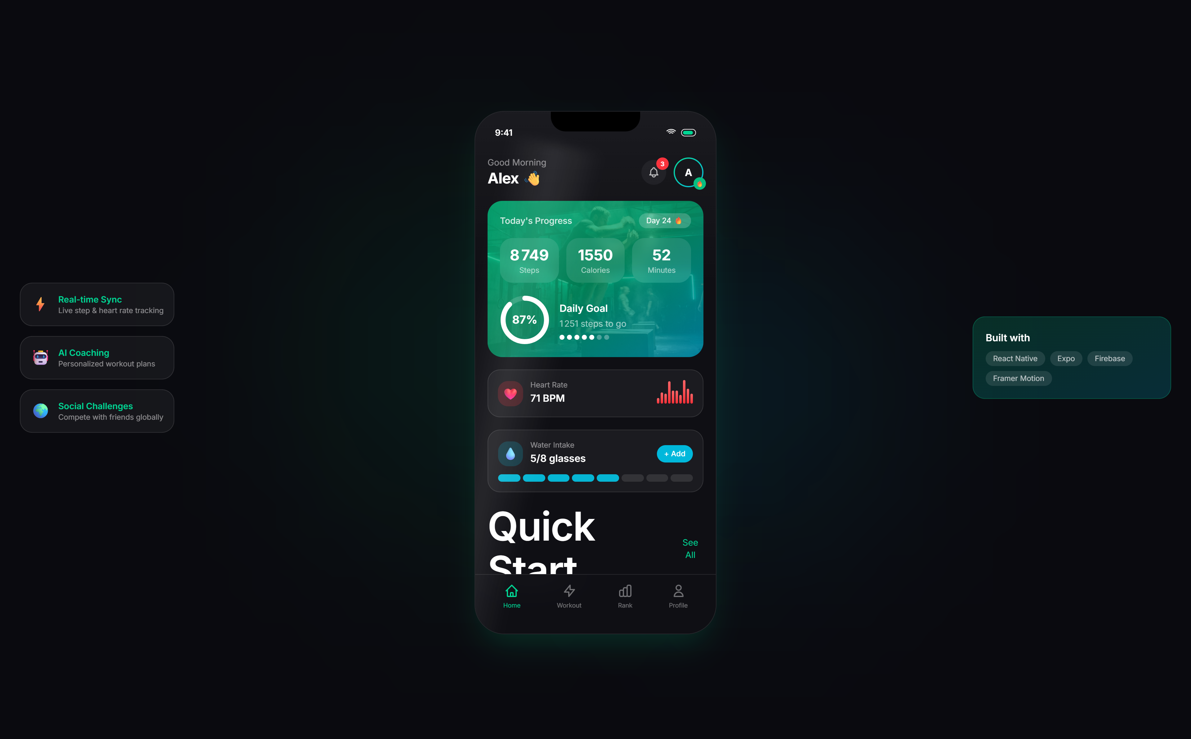 We designed and developed a fitness app that combines workout tracking with social features like challenges, leaderboards, and workout parties. The gamification elements keep users engaged long-term.